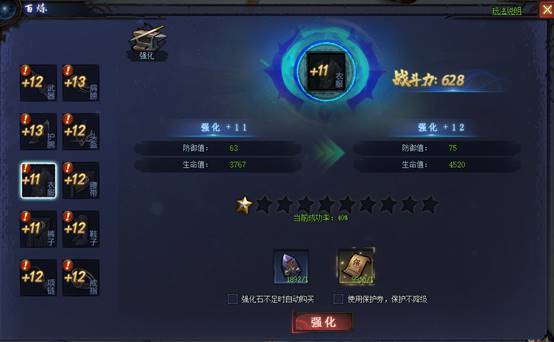 强化有一定的成功率,强化等级越高成功几率越低,强化+5之前失败没有任何损失,+5之后的装备失败后强化等级会掉1级。+5之后的装备+10之前失败最低会掉到+5;+10之后的装备+15之前失败会最低掉到+10;+15之后的装备失败会最低掉到+15。